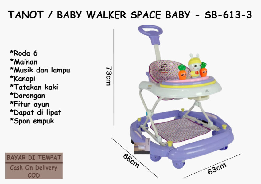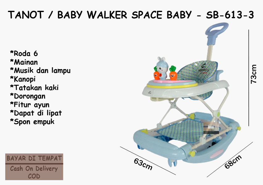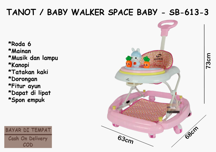Baby Walker Space Baby Karakter Kelinci SB-613-3, Baby Walker Fungsi 3IN1, Kereta Dorong Bayi, Tanot Bayi, Pink faktanya digunakan untuk alat bantu jalan bayi bayi usia 6 bulan sampai bisa berjalan. Dan faktanya mempunyai fungsi 3IN1 : Dorong, Ayun, dan Pengaman pada bagian bawah agar tidak tergelincir