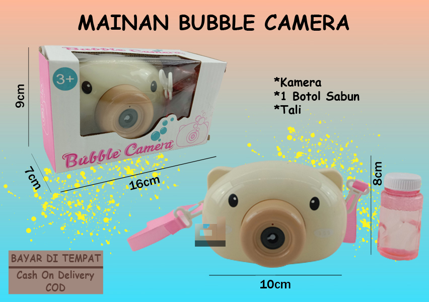 Mainan unik berupa kamera yang dapat mengeluarkan bubble (gelembung sabun) mengeluarkan musik seperti memotret / foto sebenarnya