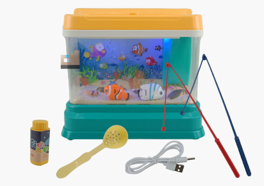 Ikan dan pancingan sudah ada magnet jadi bisa memancing ikan dengan mendekatkan pancingan dengan mulut ikan dan juga bisa memberikan makanan dari luar aquarium sudah ada magnet di botol ikan pemberi makan