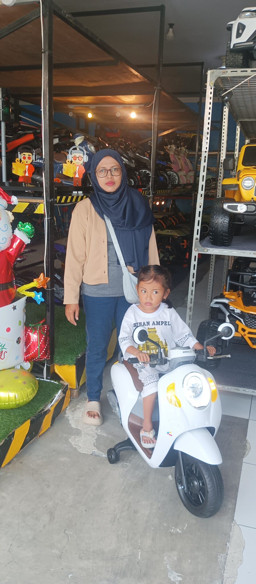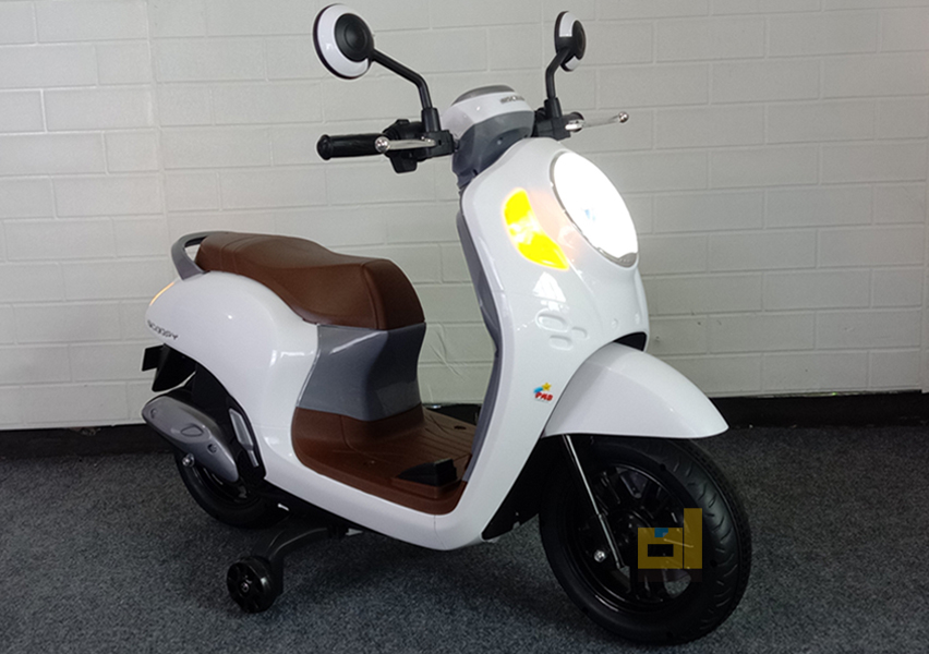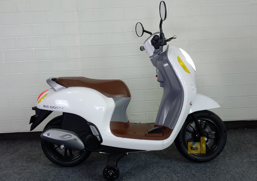 motor aki scoopy M-999, putih. Keren & elegan! Fitur Lengkap: musik, usb, gas tangan, lampu LED. Hadiah terbaik untuk si kecil!