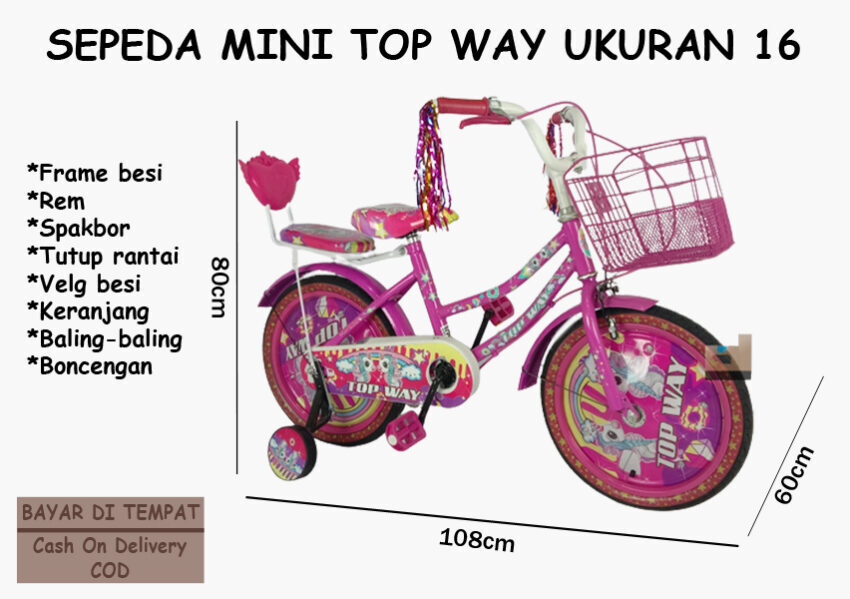 Sepeda Mini Top Way Ukuran 16, Sepeda, Sepeda Anak Perempuan Mini, Sepeda Wanita, Magenta Full